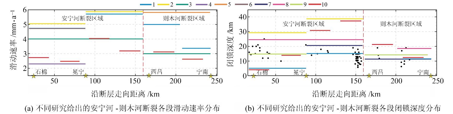 不同研究给出的安宁河-则木河断裂各段滑动速率和闭锁深度分布