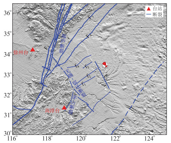 黄色线条代表苏北-南黄海盆地构造边界;沙滩球代表USGS给出的大丰海域5.0级地震的震源机制解;黑色线条代表断层。F